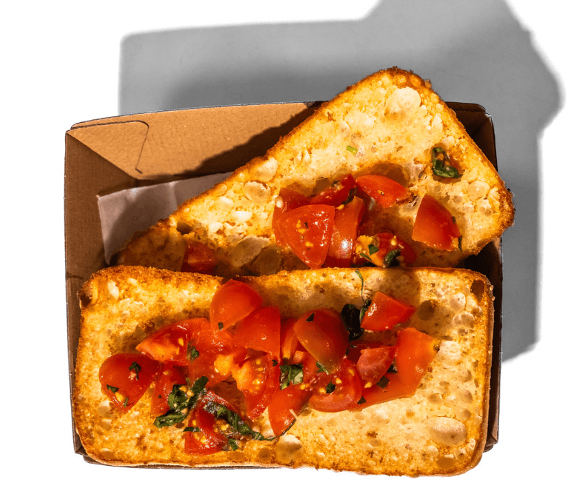 Toasted bread topped with cherry tomatoes, basil and garlic